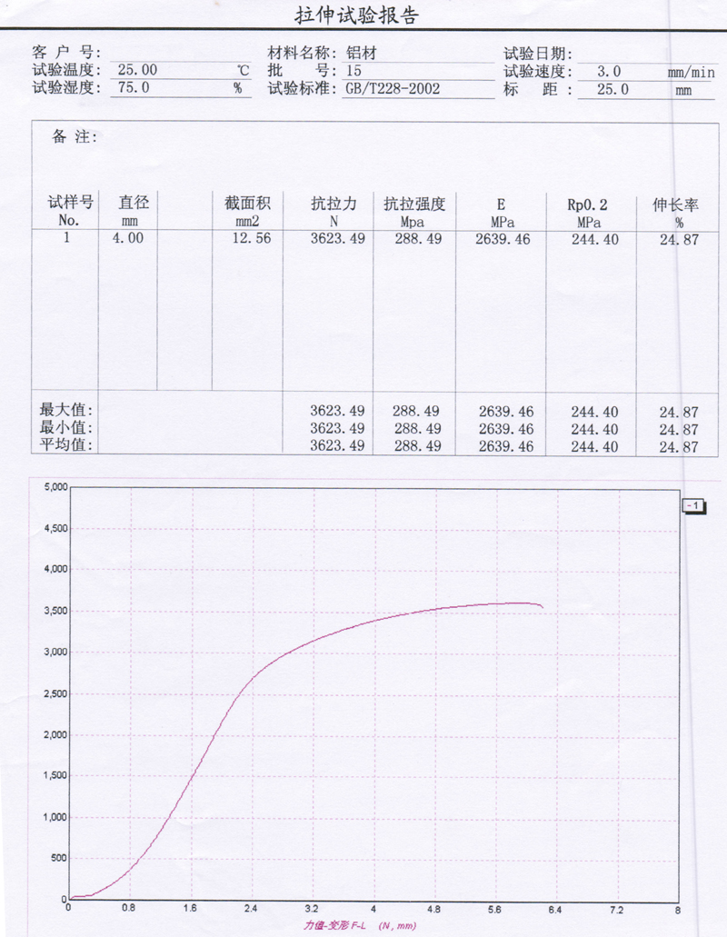 試樣(yàng)參數:直徑Ф4mm、標(biāo)準20、試驗速度:3mm/min