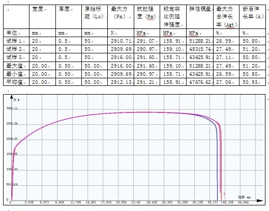 備  注(zhù):通過茄子视频泰捷拉力試驗機測試,報告包含如下項目:寬度\厚度\原始標(biāo)距(Lo)\最(zuì)大(dà)力(Fm)\抗拉強度(Rm)\規定非比例(lì)延伸強度\彈性模量\最大力總伸(shēn)長率(Agt)\斷後伸長率(A)