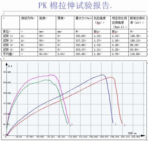 該客戶是一家專業生產各種棕墊、環保硬質棉和PK棉的廠家,產品廣泛適用於床上用品、座墊、椅墊、服(fú)裝輔料、旅(lǚ)遊用品、鞋(xié)襯墊料、沙發以及家居裝(zhuāng)飾等等。 PK棉和硬質棉均采用純棉、合成纖維和羊毛混紡精製而成,它透氣性(xìng)好,保暖性(xìng)佳,環保、質輕而富有回彈性,也是一種新型高檔環保的填充(chōng)材料,還可以用作過濾和吸(xī)(隔)音等新型料。此外(wài),PK棉,又稱PK硬質(zhì)棉、熱壓棉、無菌棉、硬質(zhì)棉、熱壓白棉氈,具有純白無雜質、透氣(qì)防水、無菌無(wú)甲醛無苯、回(huí)彈(dàn)性超(chāo)強、縱橫拉力超強、輕盈等優點,是(shì)床墊生產領(lǐng)域中最理(lǐ)想最高檔墊芯包裹材料之一,滿足現代人的健康需求,因此也深受人們的喜愛。此次該(gāi)客戶委托我司做了PK棉的拉伸試驗(yàn)方案,如(rú)下的數據及參數是(shì)用我們茄子视频泰捷的拉力試驗機試驗得出的結果: