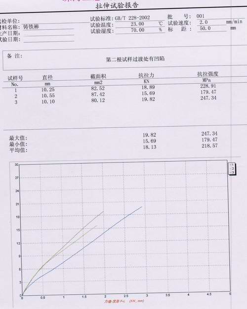 鑄鐵棒拉伸試驗報告內容:①尺(chǐ)寸 ②最大力 ③抗拉強度