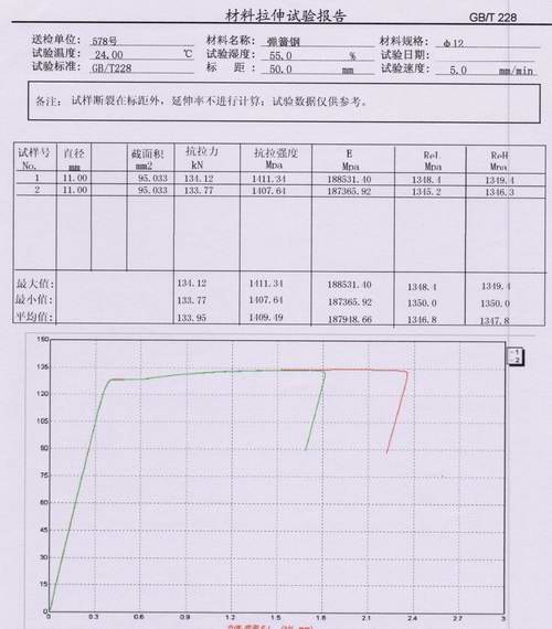 彈簧鋼拉伸試驗報告內(nèi)容:①試樣尺寸 ②最大力 ③ 彈性模量(E) ④ReH ⑤ReL ⑥力值-變形曲線