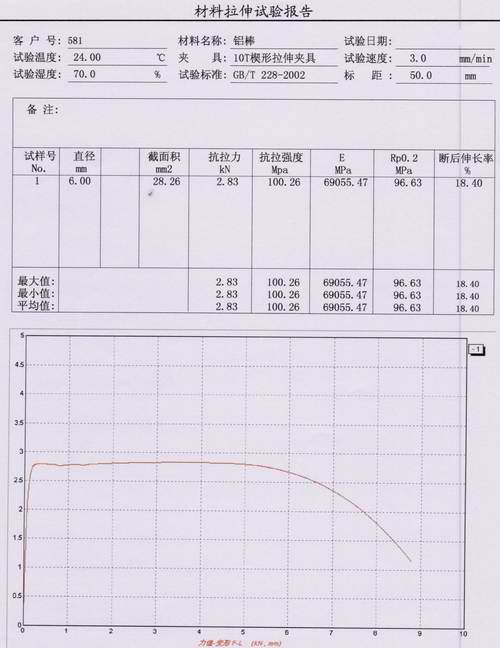 Ф6mm鋁棒抗拉強度(dù)的測定報(bào)告內容:鋁材①截麵積 ② 抗拉力 ③抗拉強度 ④ E ⑤Rp0.2 ⑥斷後伸長率