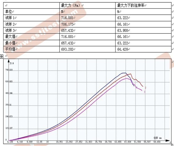 求取參數:最大力(lì) 最大力下的延伸率 無紡布拉伸試驗報告及特征曲線: